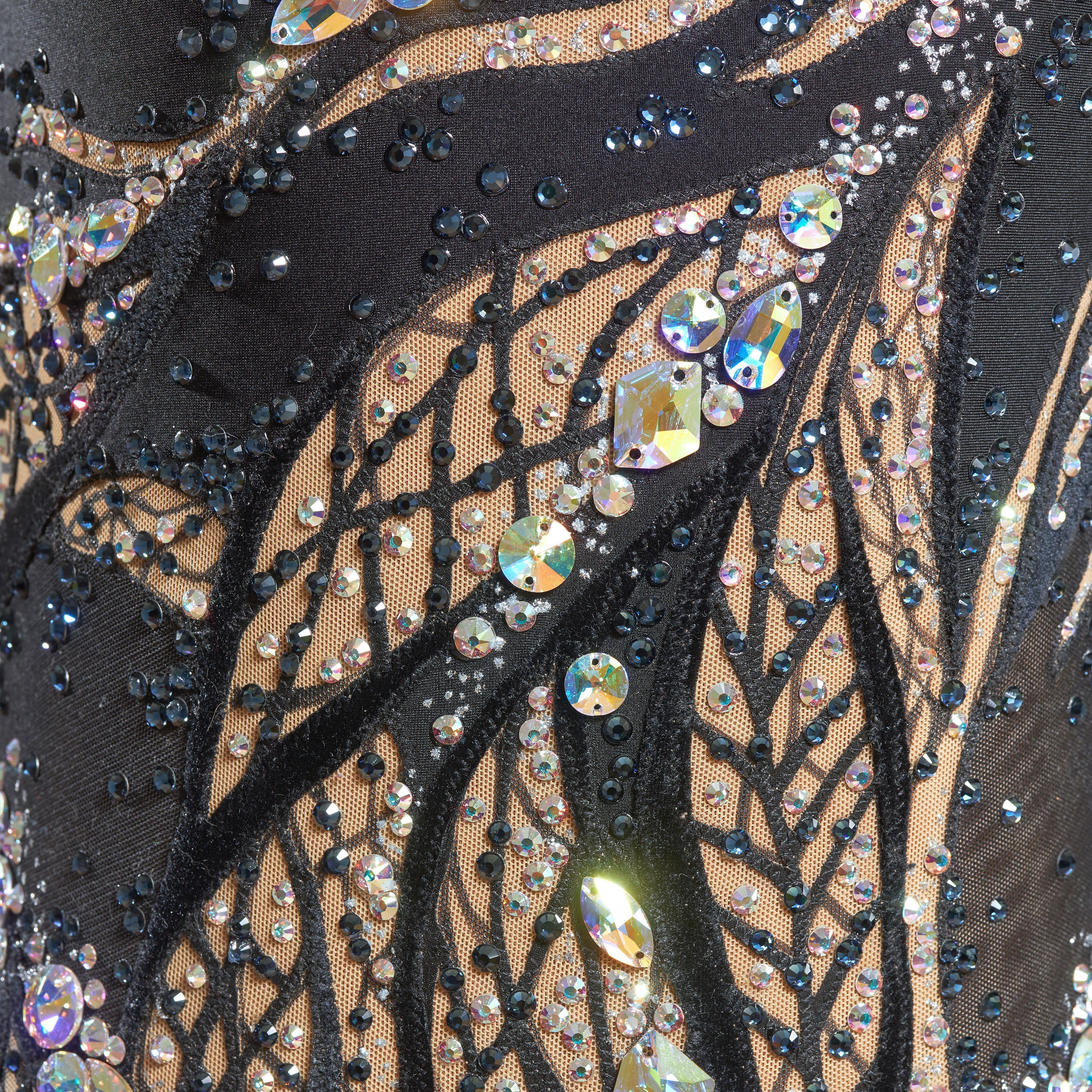 Всё верно, не влюбиться не возможно. Крошечные кристаллики, будто капли росы, разбежались по поверхности купальника. Растительный декор из листьев в центре композиции. Декор струится, подчёркивая фигуру и завершая яркий шикарный образ.