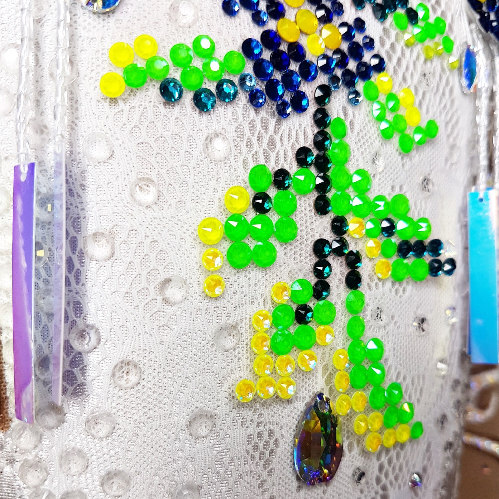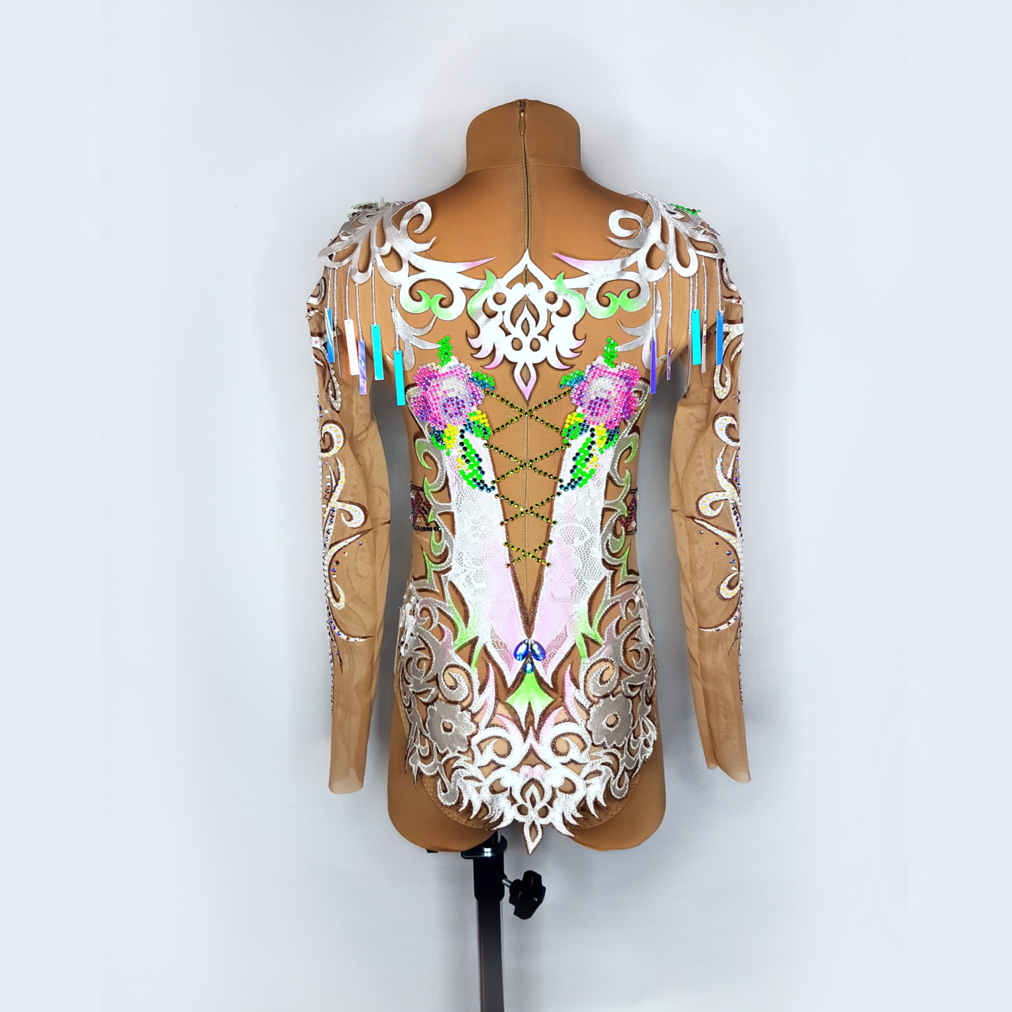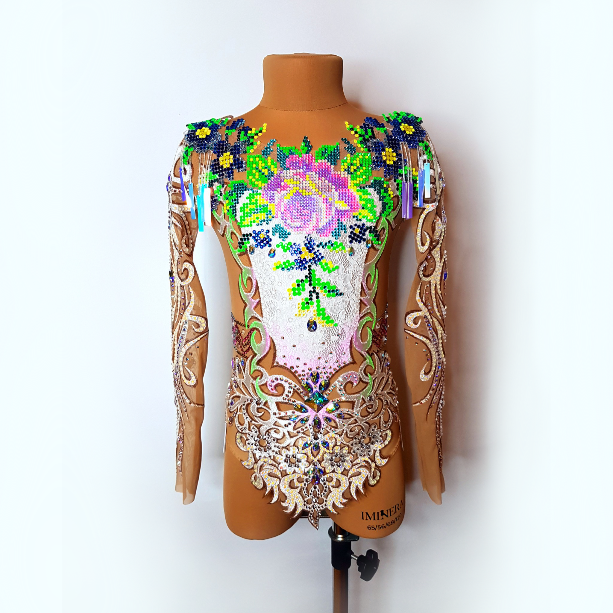 В своей работе я соединила две эти любви. Вышивка крестиком вдохновила меня на создание цветочного рисунка из страз, в котором я соединила множество оттенков Swarovski Crystals. Кристаллы правят балом в этом купальнике для художественной гимнастики
