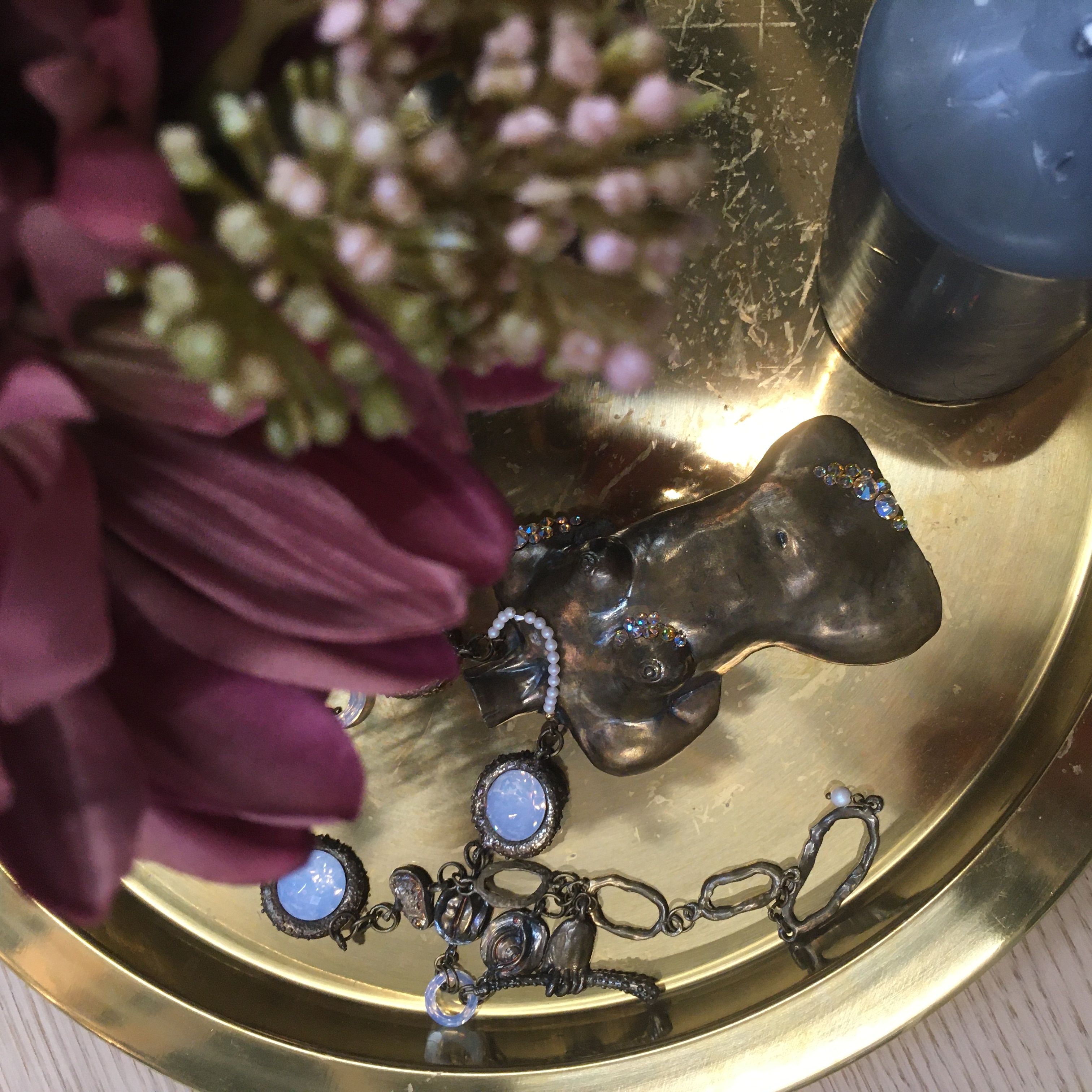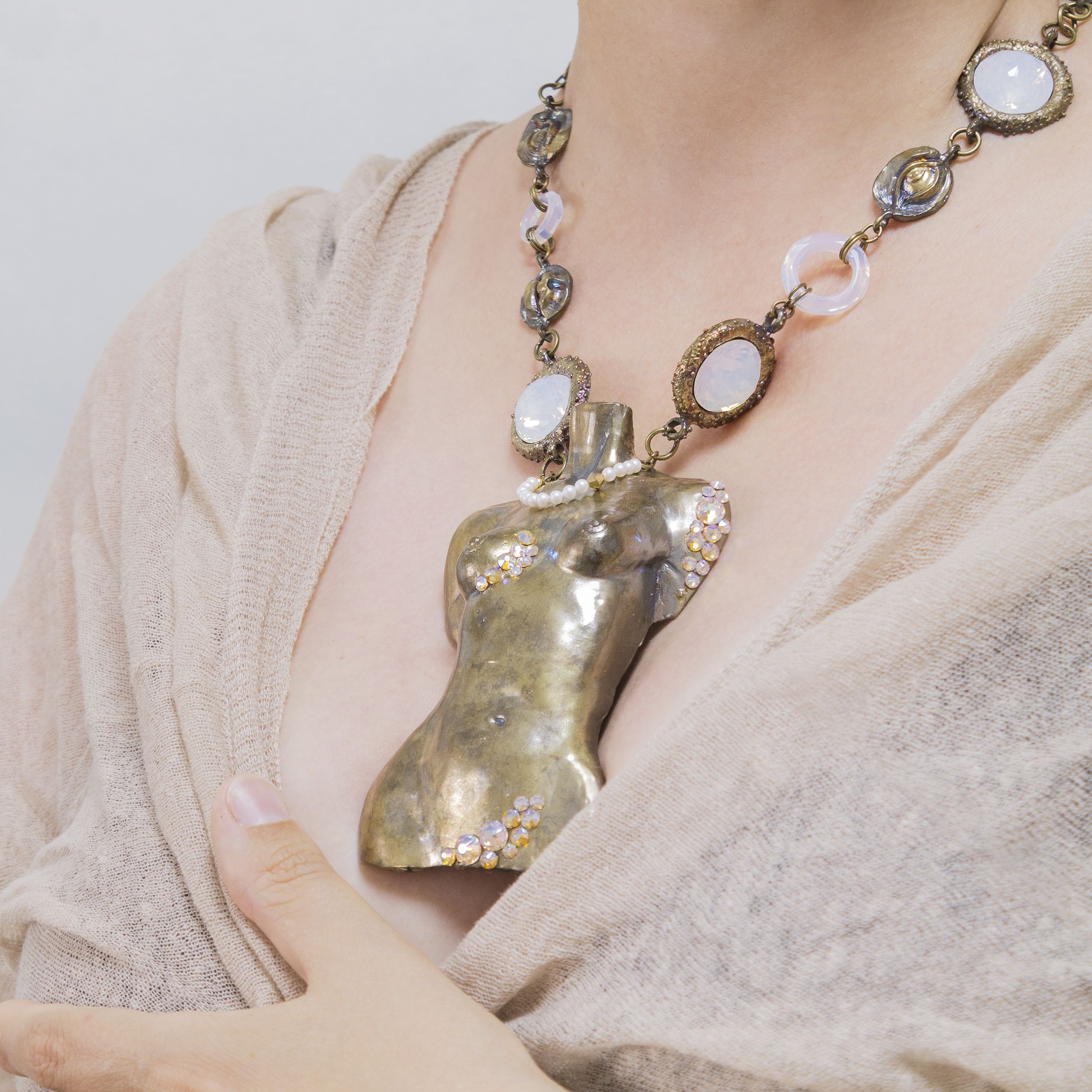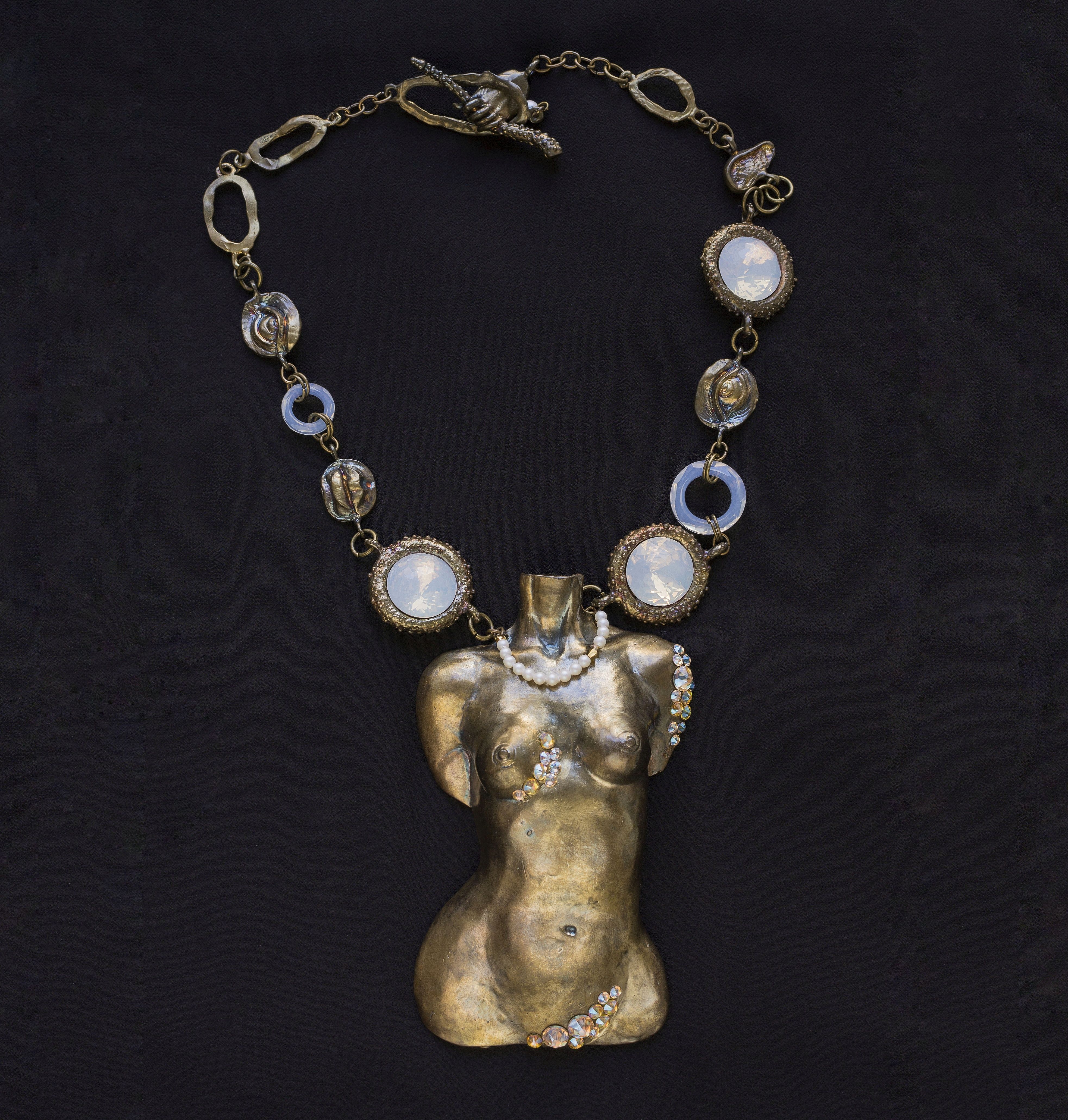 Колье выполнено из латуни и кристаллов Cosmic Ring, Dome Round Stonе,Xirius Rose, которые становятся словно бесконечно бездонными, играя светом и рефлексами цвета металла.