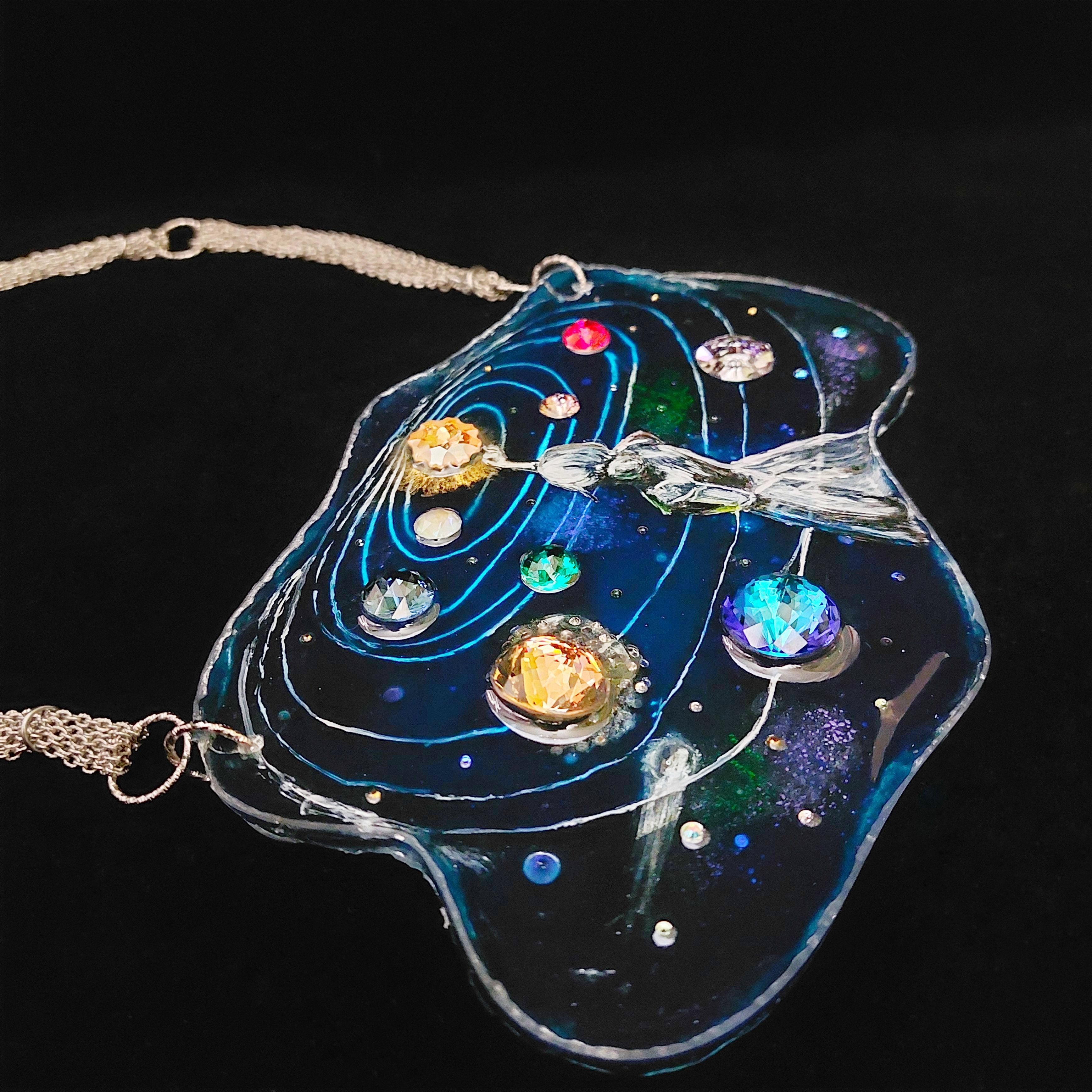 Основная часть колье выполнена методом послойной росписи по эпоксидной смоле. Этот метод дает возможность сделать элементы росписи более объемными. С помощью этого метода я хотела показать глубину космоса, его некую бесконечность.