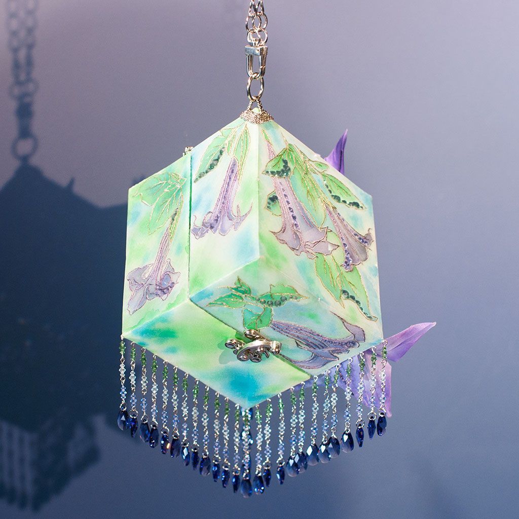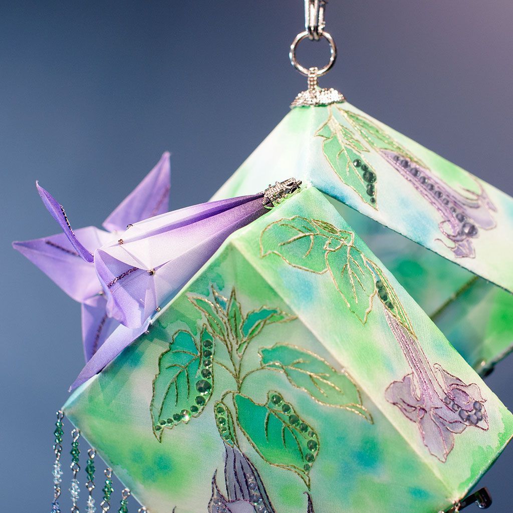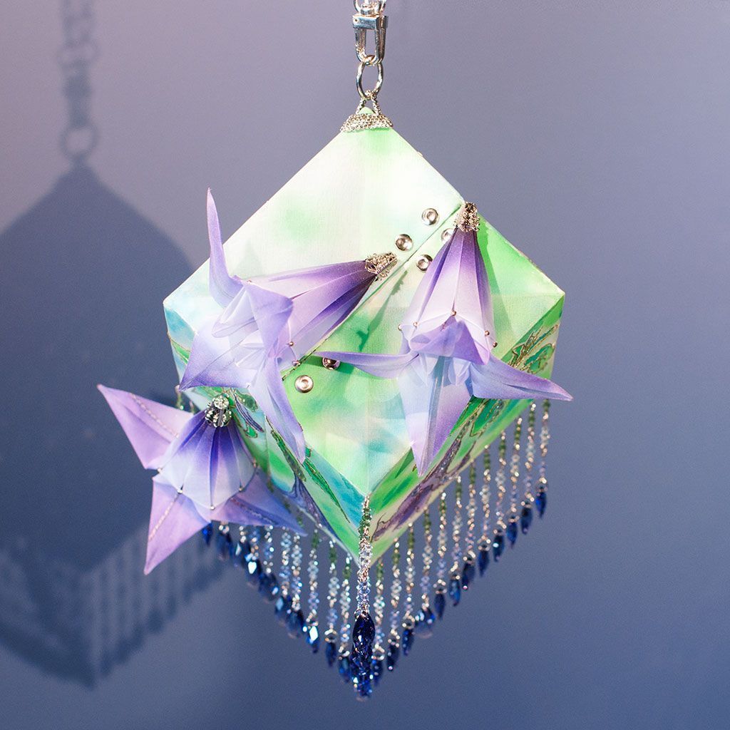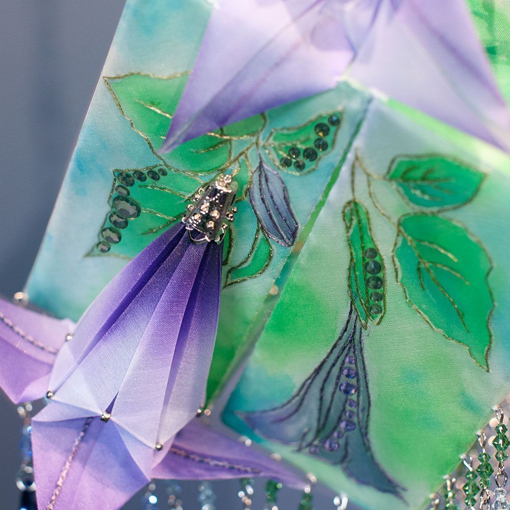 В моей вселенной .evoli я рассуждаю о связи конструкции и свободной формы. Есть два типа творцов - люди потока и люди расчета. Я принадлежу второму лагерю, все строится, конструируется и вымеряется. Однако первый подход имеет очевидные преимущества, поэтому в каждой работе я стремлюсь к балансу хотя бы на уровне идеи. Например здесь грани .evoli воплощены в максимально точном искусстве - оригами и в минимально подходящем для жесткой формы материале - ткани. К космическим мотивам отсылает фон росписи в технике холодного батика, а также образ цветка-дурмана. Ну и разумеется декор кристаллами .evoli в лавандовом оттенке.