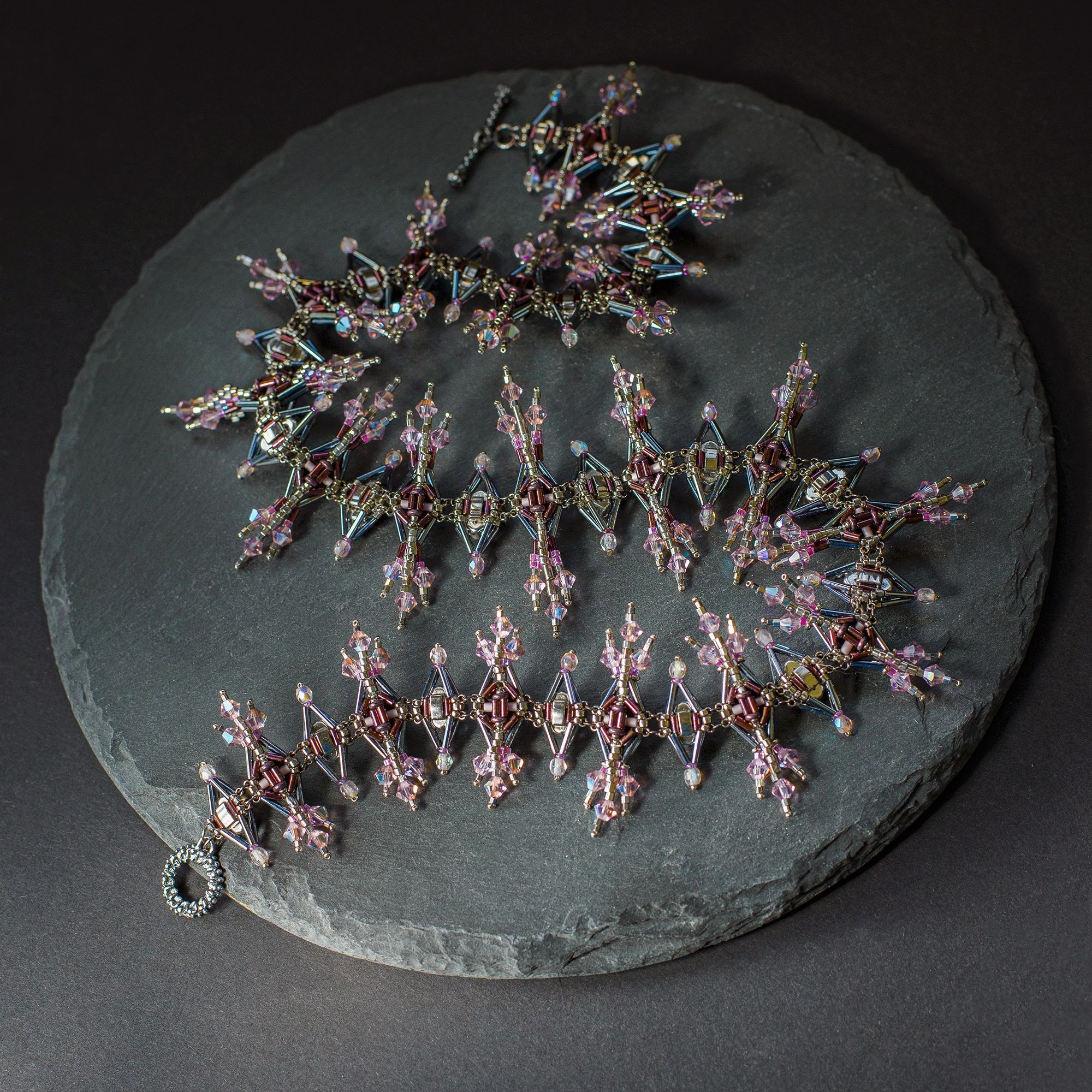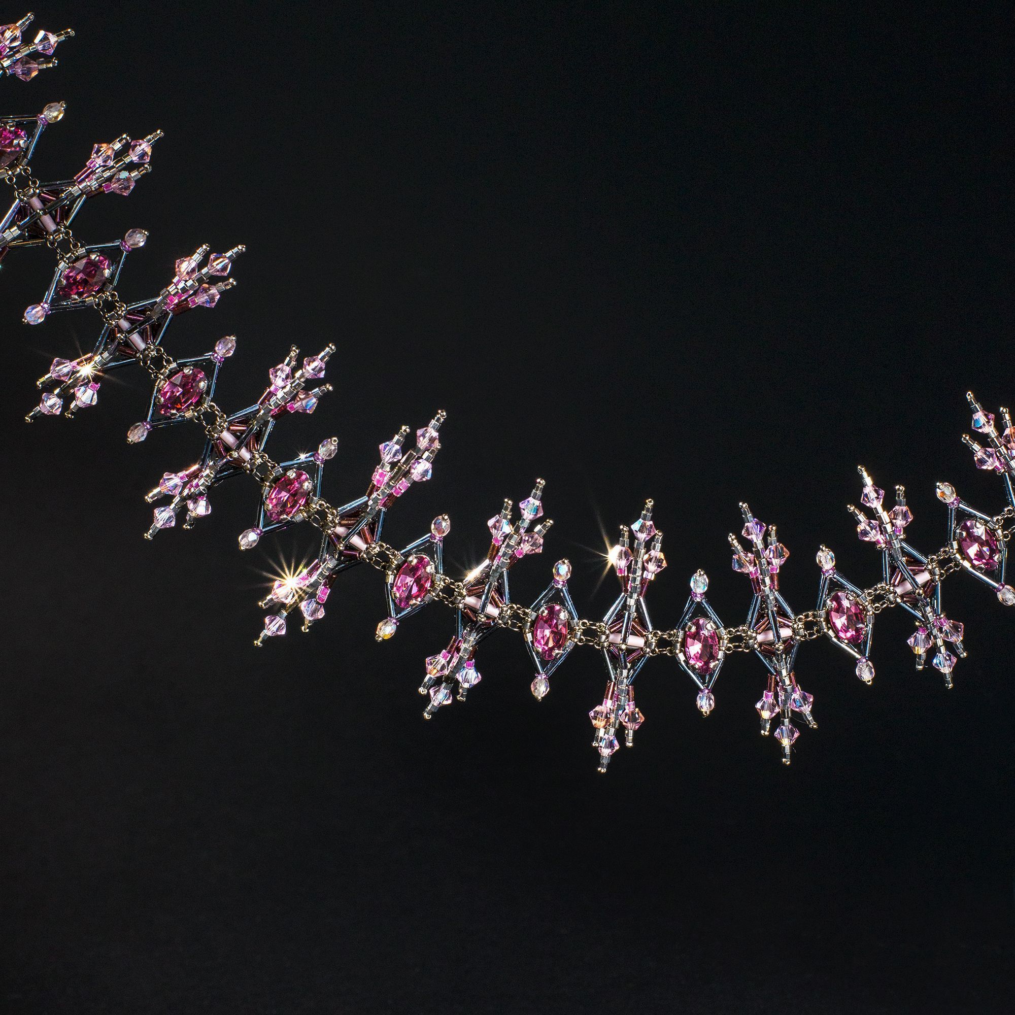 Pinnacles (Пинакли) — это мое размышление на тему величественной готической архитектуры и скромная попытка передать этот стиль в украшении. Меня вдохновили остроконечные башенки-пинакли готических соборов, украшенные изящными завитками-краббами, стрельчатые окна, сложная геометрия сводов и в целом то ощущение стремления ввысь, которое характеризует архитектуру готики. В своей работе я старалась воплотить эти образы, и кристаллы .evoli, благодаря их сложной форме и четким граням, мне особенно в этом помогли. В результате получилось колье в виде череды остроконечных шпилей, плавно увеличивающихся в высоту к центру украшения. Сочетание строгих стальных оттенков бисера и нежной сирени кристаллов — словно вид на крыши готического собора в лучах рассвета.