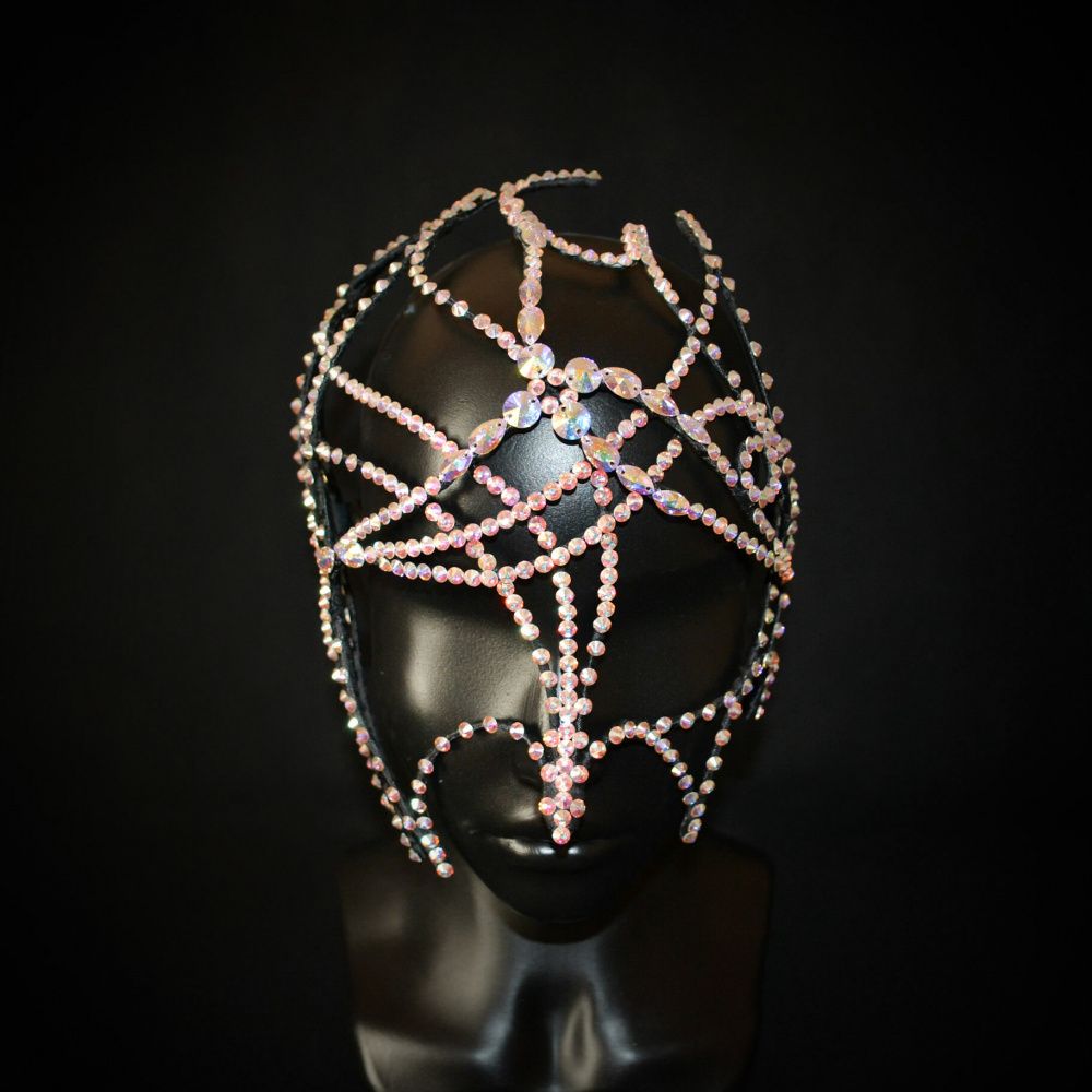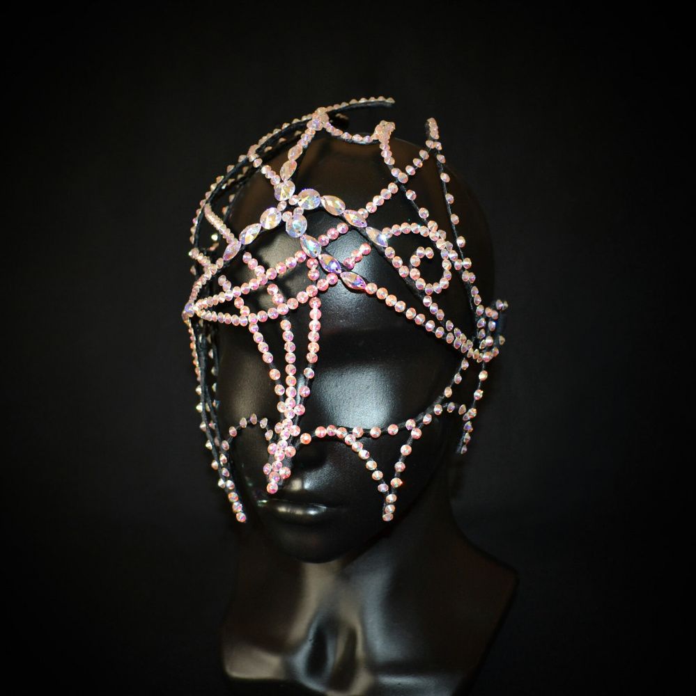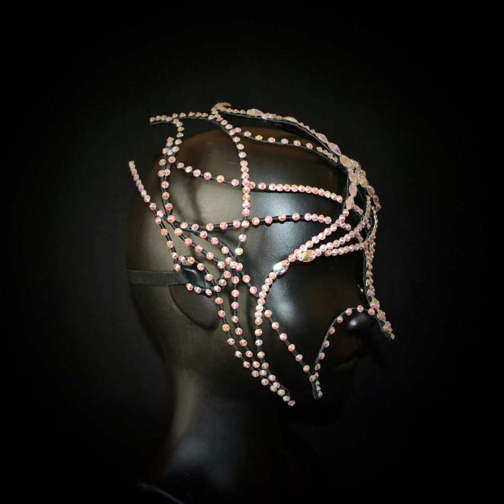 Эта маска олицетворение северного сияния, многогранности цветов, переливов, зависящих целиком и полностью от света, падающего на изделие. Отсутствие симметрии, смещенный центр композиции, точный подбор конкретных камней – кристаллов Swarovski, делает изделие уникальным и неповторимым.