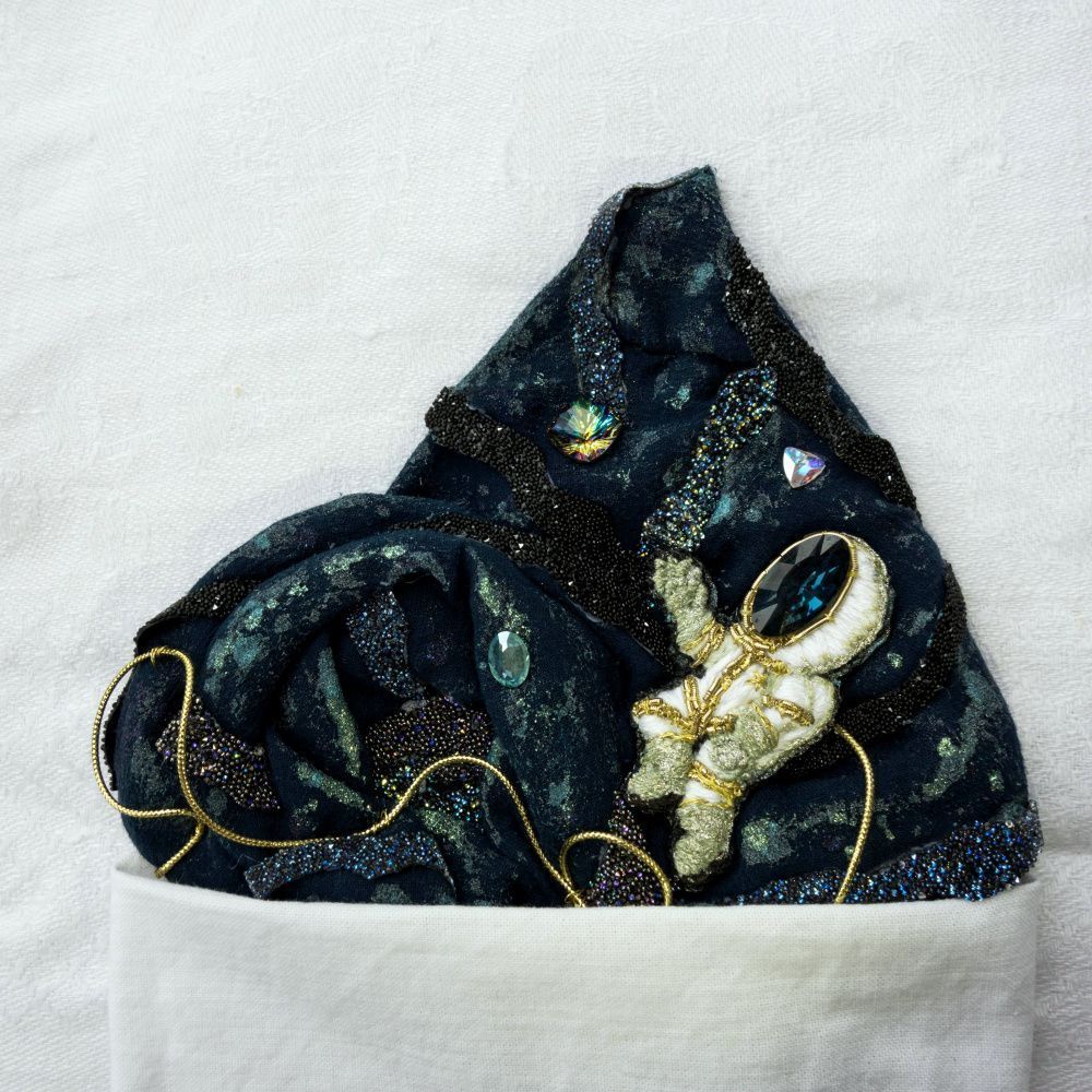 Одна из сторон личности моего супруга – это любовь к жанру научной фантастики, и именно поэтому платочек выполнен в виде маленького кусочка большого космоса, в центре которого – отважный исследователь, готовый к покорению