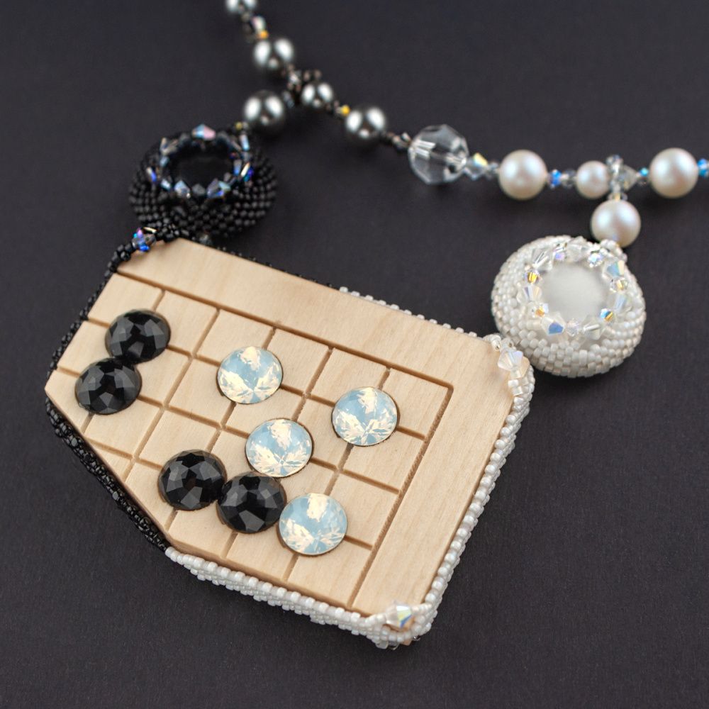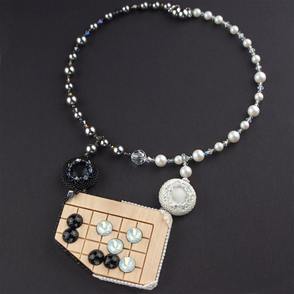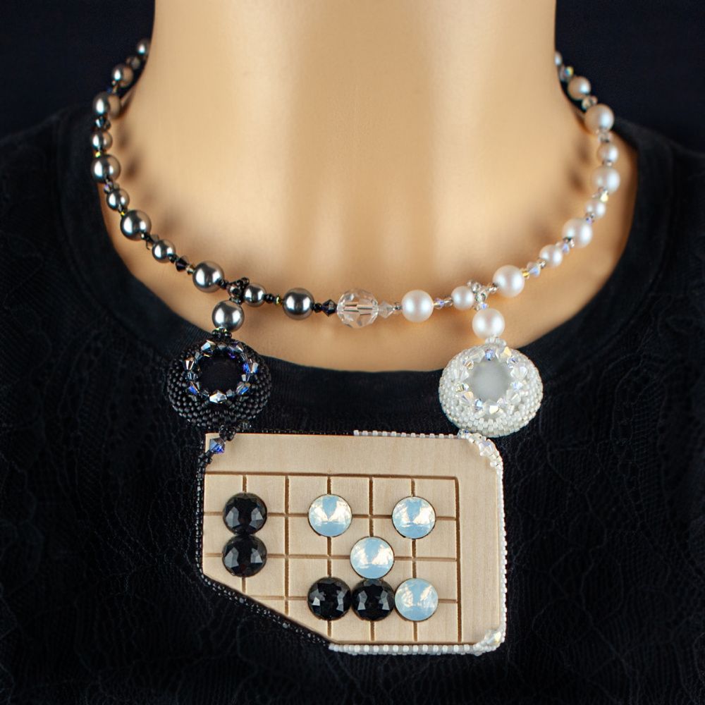 Моё колье - посвящение игре и в нём использованы реальные камни для го, чёрный и белый. Cамо колье представляет собой часть гобана с моментом одной из известных игр.