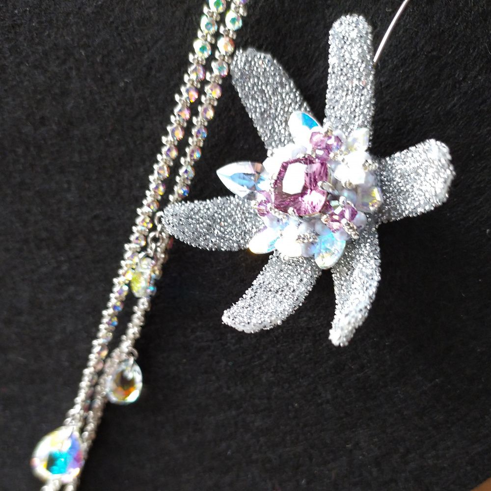 Вот она, целая Вселенная, со звездами, далекими и близкими. Серьги-звезды будто повисли в воздухе за счет швенз-крючков. Как Млечный путь – небосвод, так соединяющие две серьги цепи из Crystal Mesh обнимают шею. И вдруг – летит звезда. Смотри, какой яркий след тянется за ней. Ты знаешь, что делать, – скорее загадай желание! Шейное украшение легко трансформируется в струящуюся подвеску одной «звезды». Цвет Iris - символизирует космос, нечто мистическое.