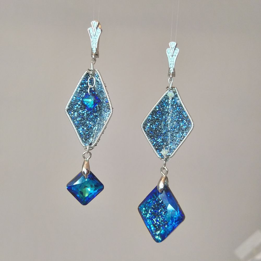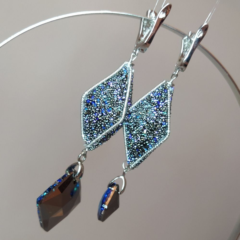 Серьги полны неожиданностей - новых граней. Это и две кристальные ткани - Transparent Crystal Moonlight и Black Crystal Moonlight, которые благодаря прозрачной основе первой дополнили друг друга и дали совершенно новый и неожиданный эффект. И ассиметрия, и разные подвески - всё продолжает и поддерживает тему неожиданных новых граней, которыми все время удивляет нас жизнь.