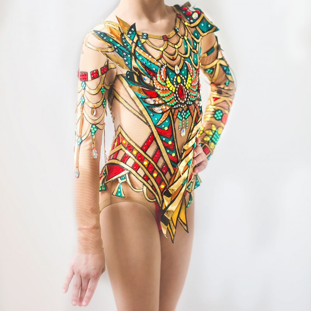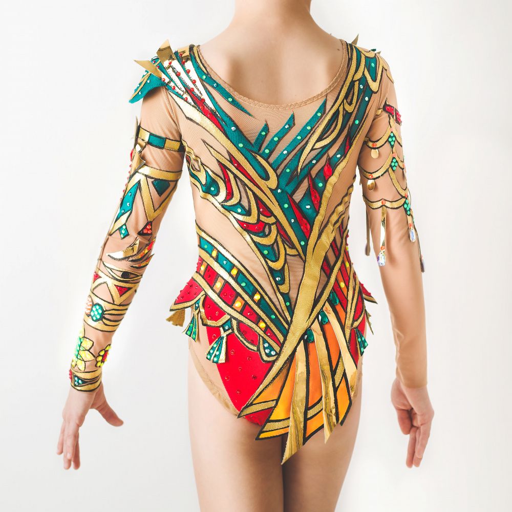 В основу купальника легли три цвета бифлекса: бордово красный, изумрудно зелёный и золотой.