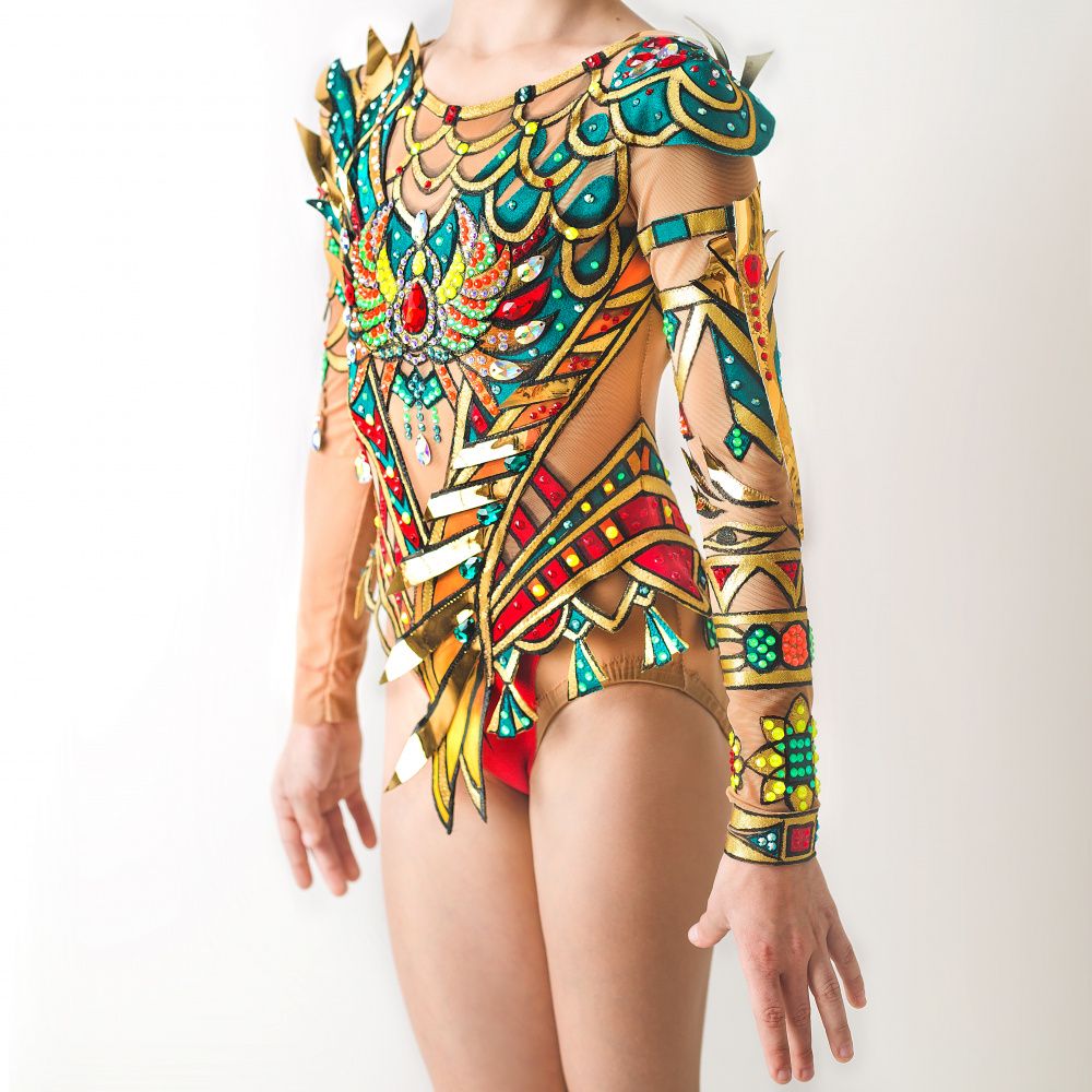 Так же в изготовлении данного изделия применялись такие современные материалы, как золотой винил и глитерная ткань. Именно такие плотные и сверкающие материалы придают костюму необходимый объём и сияние. И в заключении, к купальнику добавились удивительной красоты кристаллы, которые придают особенную эффектность и делают данный образ цельным и завершенным.