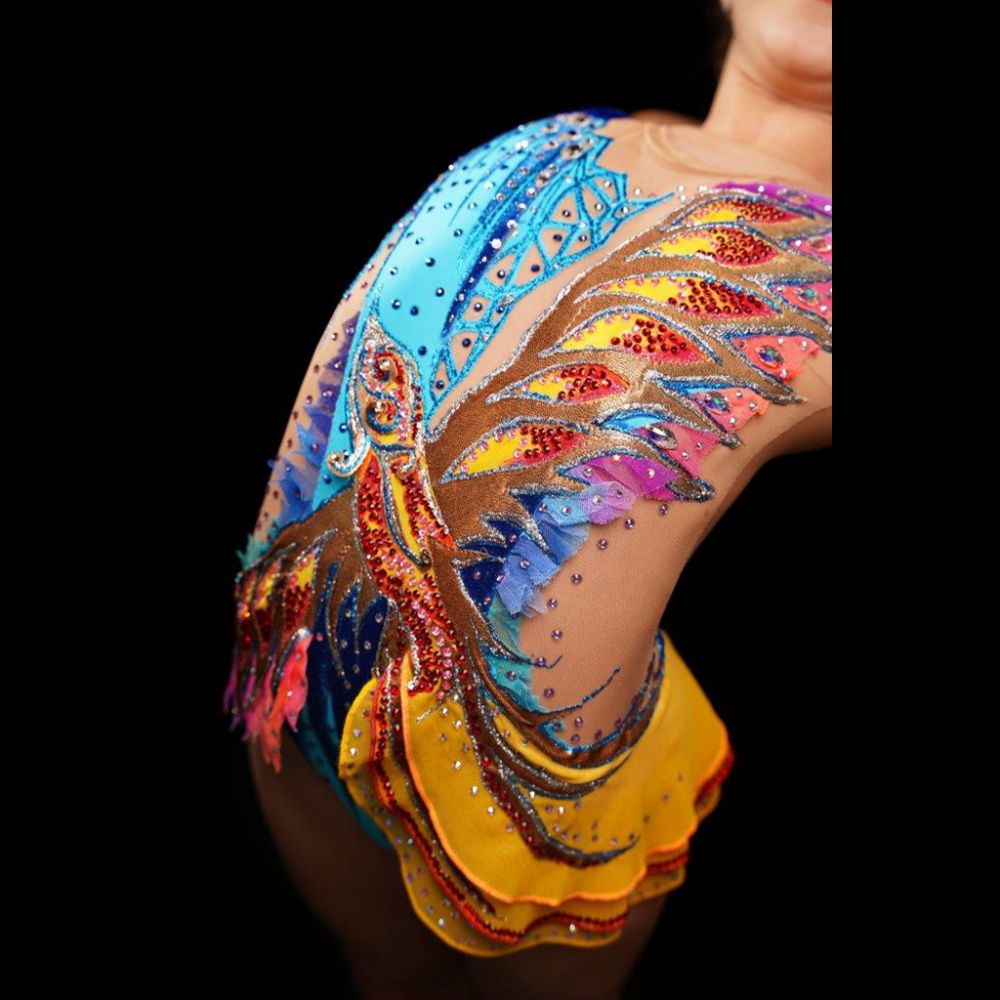 Я согласна с описанием конкурса, что наш мир полностью изменился (удивительно, но это произошло всего за несколько месяцев!). Мне сразу же пришла в голову мысль изобразить птицу Феникс. Это символ Нового начала, нового яркого сияния, новой эпохи, новой идеи и духовного изменения. Я хотела, чтобы мой купальник двигался вместе с гимнасткой, а птица летела, давая всем надежду на новое начало. Он имеет яркие цвета (в основном золотой / желтый, как солнце, но также красный/розовый и фиолетовый) и летит в синее ночное небо. Левое крыло меньше по размеру и как-будто "в ловушке" (из-за ситуации, сложившейся в мире). Но правое крыло большое и прямое, потому что не смотря ни на что, птица побеждает и снова воспаряет. Это можно увидеть на задней стороне купальника, где птица снова свободно летит ( у нее полностью расправлены крылья и прекрасный длинный хвост).