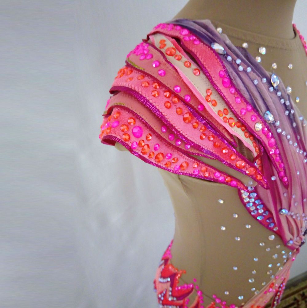 Окраска драпировки, на передней части, выполнена в технике ‘шибори‘. Модульные элементы оживляют модель, создают эффект распущенного крыла. Низ рукава оформлен драпировкой из сетки, имитирующей перышки. Юбка выполнена из тканей разных фактур. Законченность образу придает сияние камней, блеск и великолепие кристаллов создают некую сказку. Цветные стразы завораживают своим мерцанием и добавляют глубины цвета!