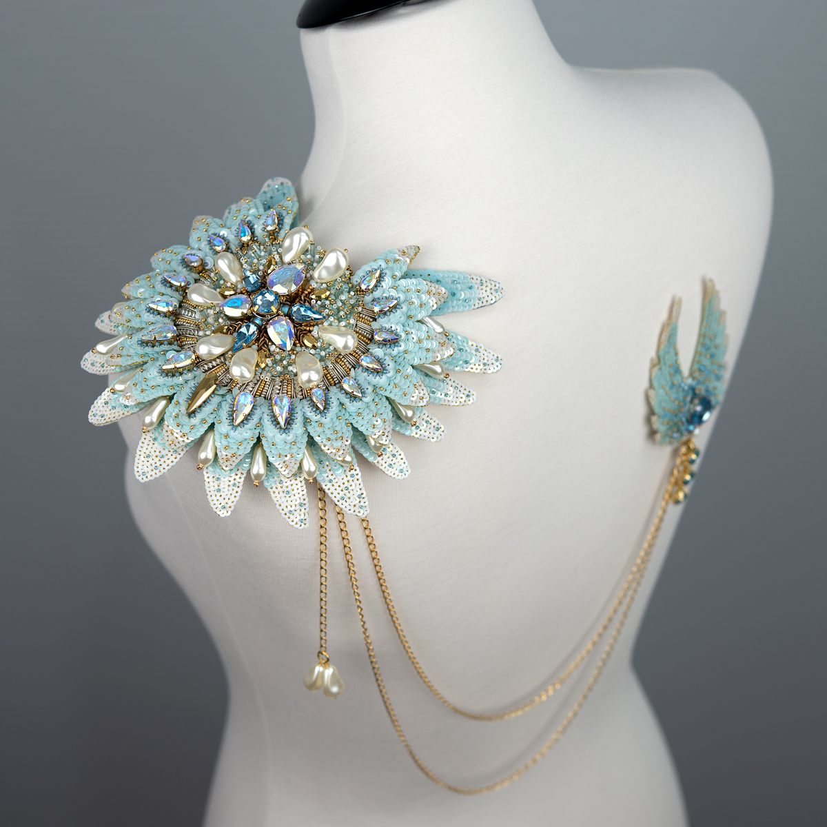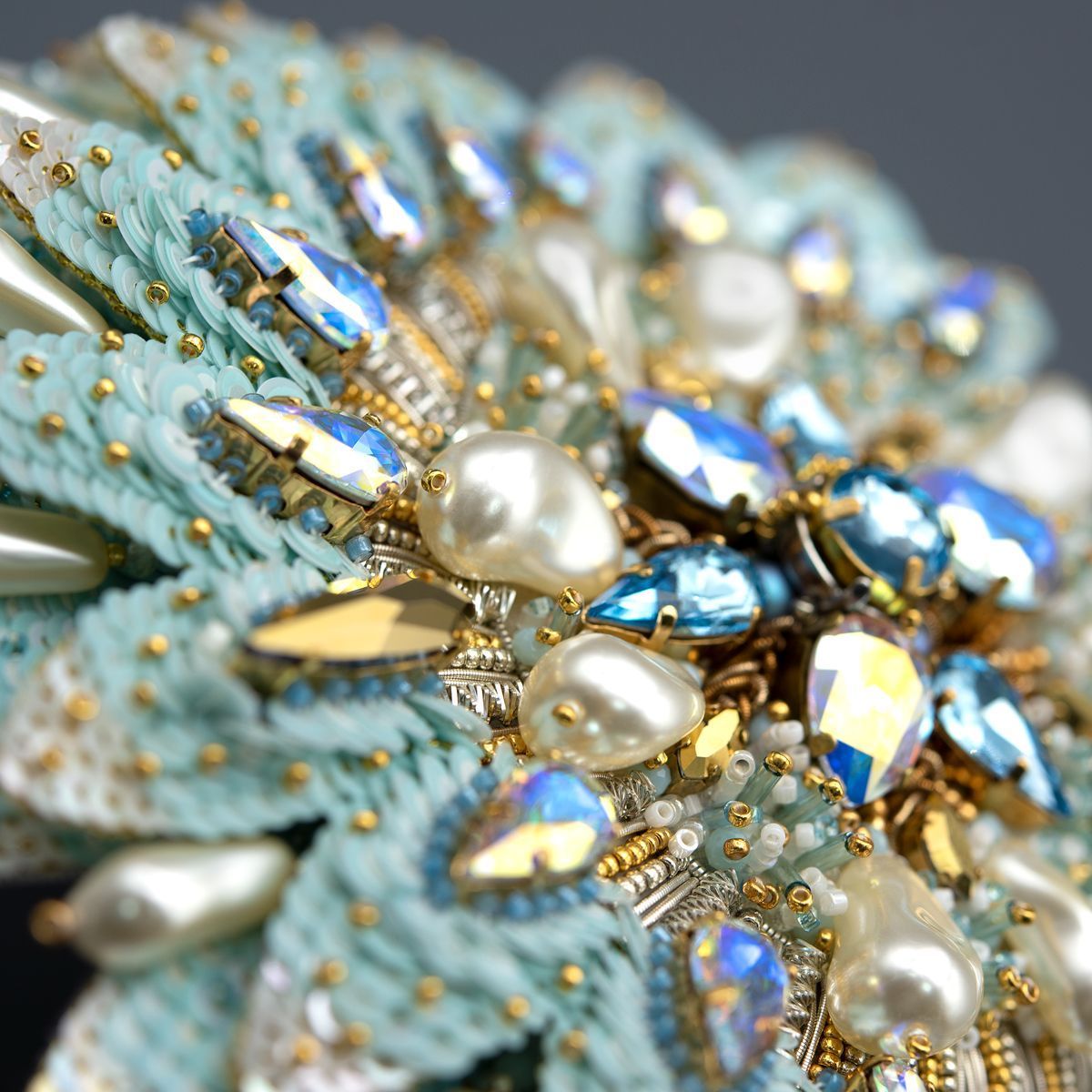 Нежно-голубая цветовая гамма, в сочетании с золотой фурнитурой, создает атмосферу небесной легкости и величия, а каплевидные и круглые кристаллы Swarovski напоминают слезы радости или капли росы, которые переносят нас в миры чудес и загадок. В своей работе я постаралась изящно переплести реальное ( фактуру, цвет)с фантастическим ( форма и содержание), выявляя тонкую грань между нашей природой и мистическими тайнами зазеркалья.
