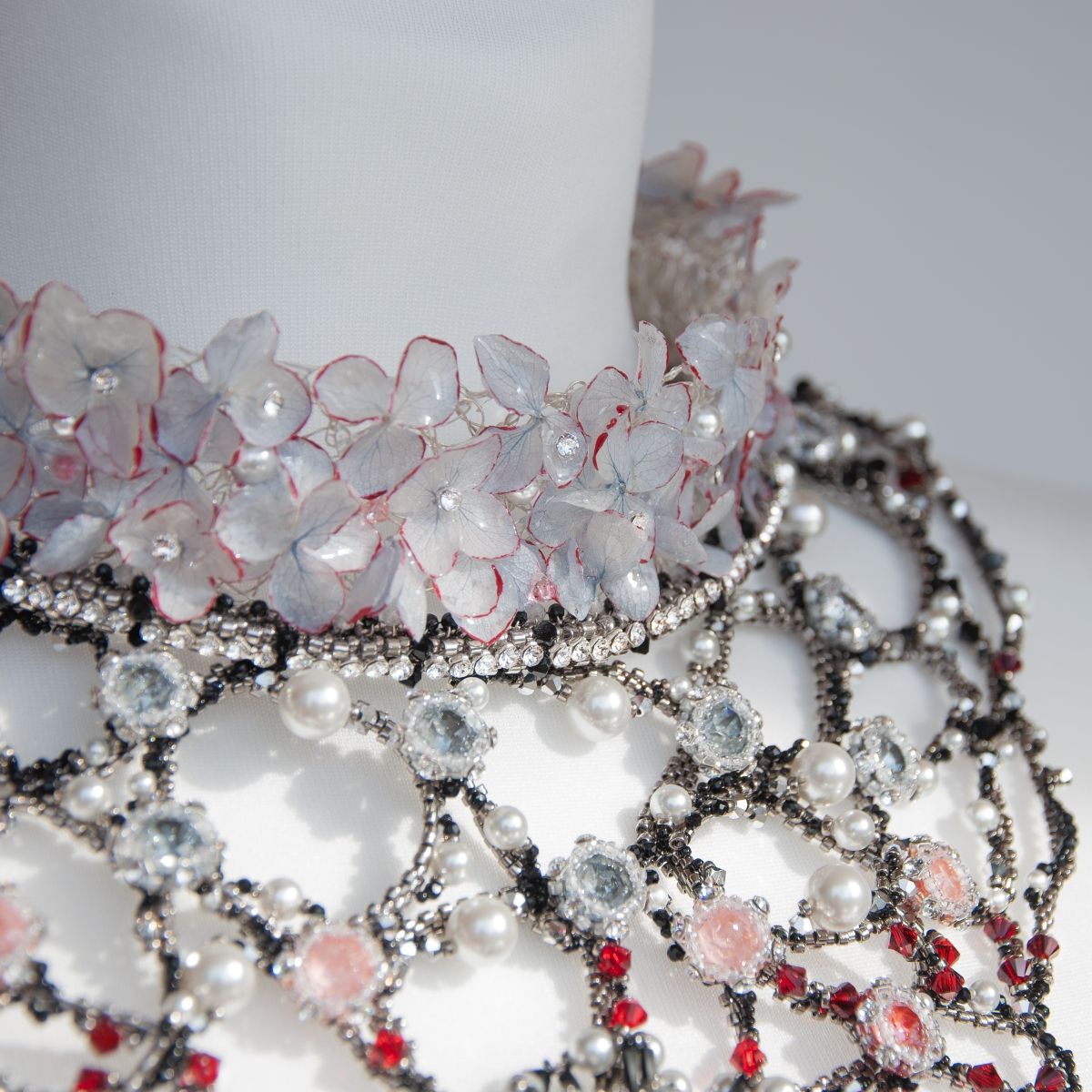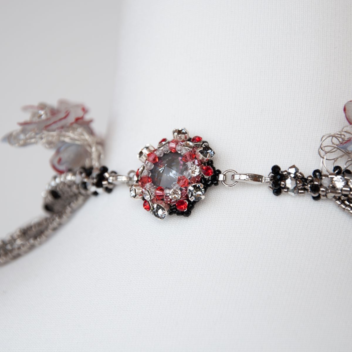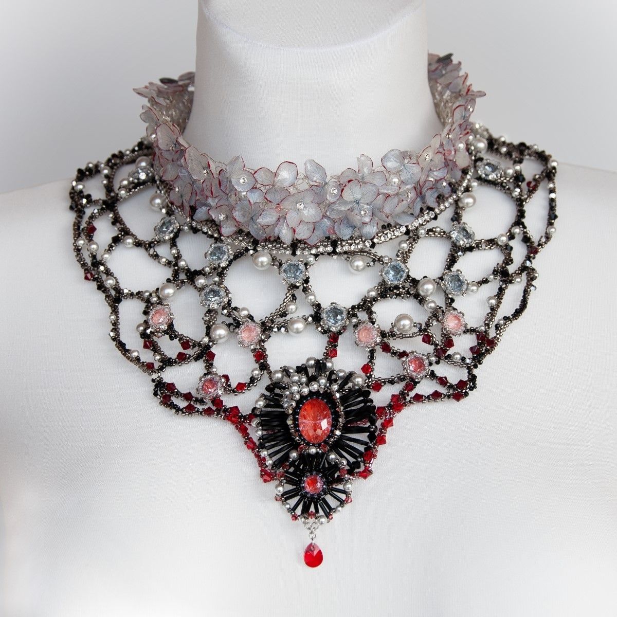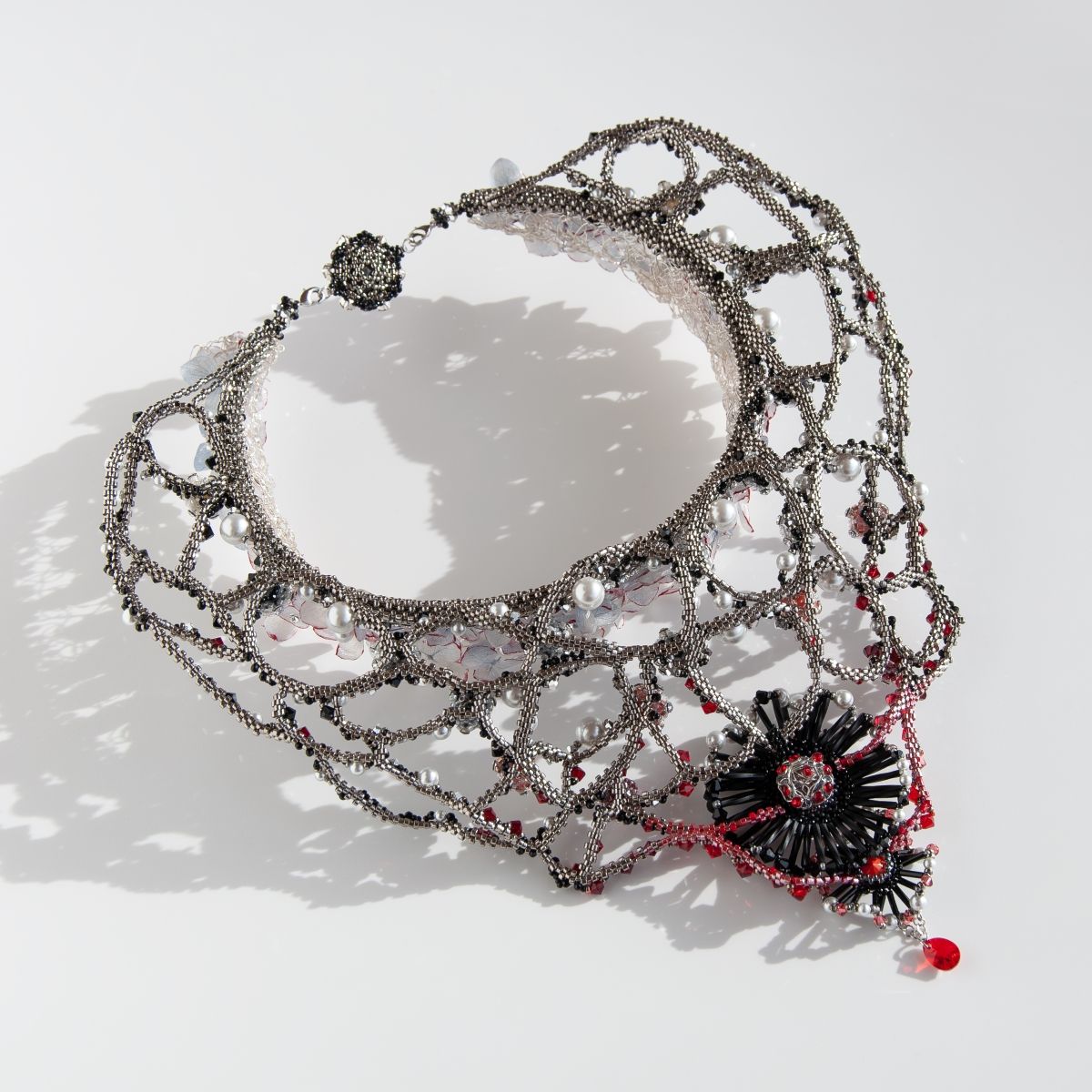 Колье «Фата-Моргана» воплощает таинственную игру притяжения и обмана. Невесомые цветы в верхней части украшения, отражают хрупкость и притягательность фантастических образов. Пройдя границу невозврата, сознание, окутываемое темной кристальной материей, погружается в глубины неведомого. В центре композиции — сущность, манящая своим холодным блеском, алчно впитывающая эссенцию жизни.