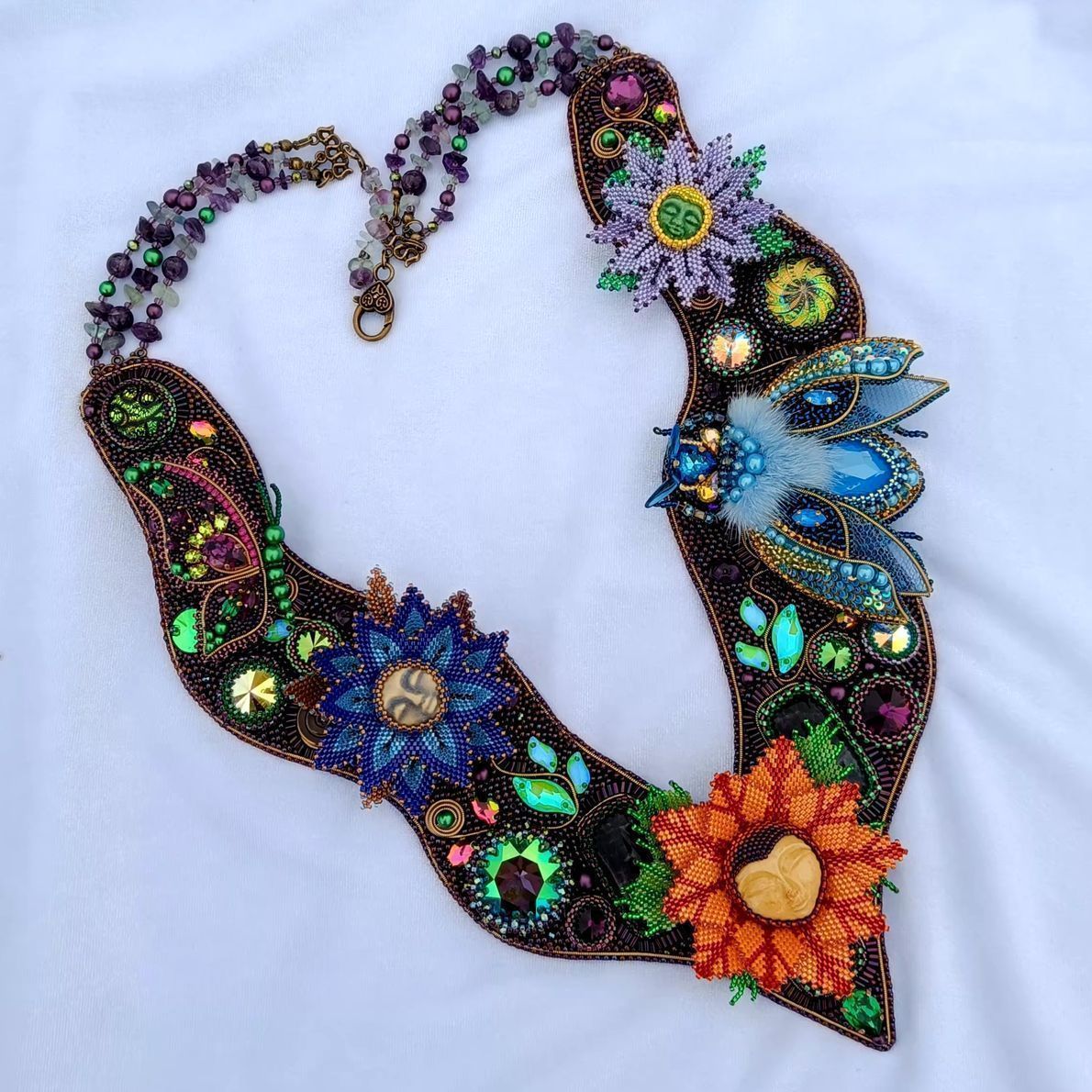 Аметистово-зеленая основа с растительным узором расшита кристаллами, флюоритами, аметистами, богемскими пуговками и бусинами лэмпворк. Это благородный и дорогой сад камней, богатство которого в материалах, формах, глубине цвета.