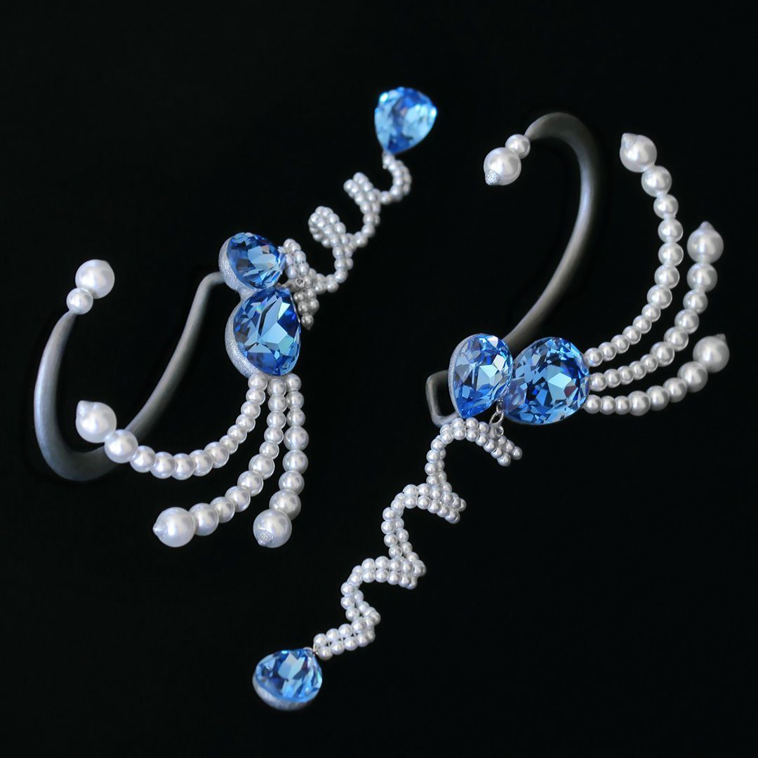 Украшение парное, выполнено в виде кафф. Их конфигурация полностью разработана и создана с нуля собственноручно. Все элементы собраны в единую монолитную структуру, за исключением подвижного подвеса, который добавляет небольшой игривости запечатлённому образу.