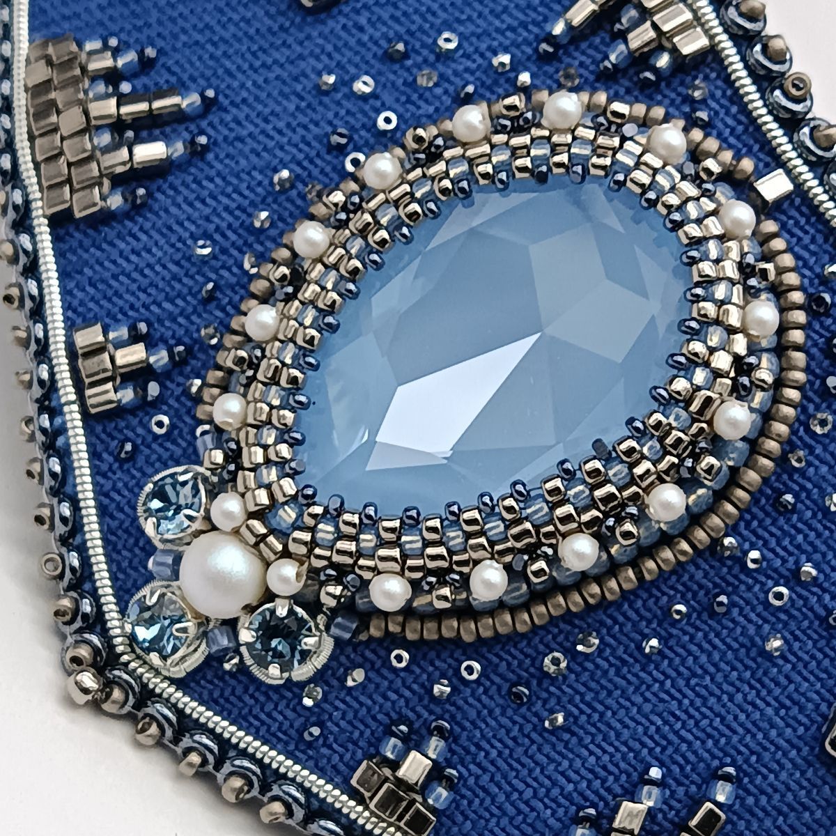В диадеме «Красавица мегаполиса» объединились: джинсовая ткань, сохраняющая свои позиции в современной моде, кристаллы и жемчуг Swarovski, которые с успехом заменили натуральные жемчуг и драгоценные камни. Кристаллы цвета Sky Ignite и Silver Night красиво мерцают на фоне синего денима.