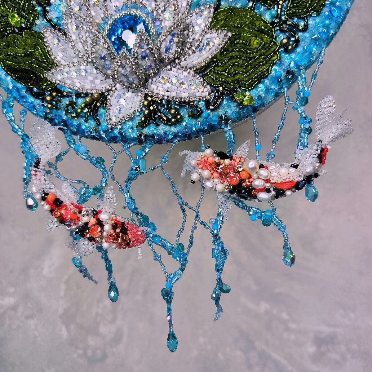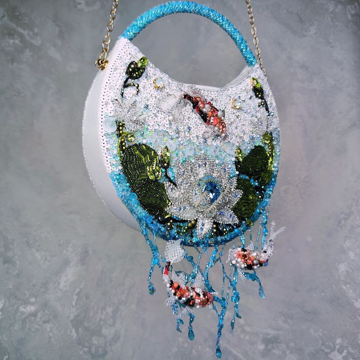 Старинная китайская легенда гласит о Карпе, преодолевающем бурные воды реки. Его упорство было столь велико, что, двигаясь против течения, карп смог перепрыгнуть водопад ("Драконьи врата") и превратиться в Дракона. С тех пор карп стал символом стойкости, выносливости, целеустремленности и упорства, а изображение карпа помогает исполнить желания, добиться успеха. Лотос тоже неслучайная деталь сумки – в китайской культуре это - символ перемен ,трансформации, жизни и чистоты.  В то время как объемный Дракон на обратной стороне сумки, которого можно носить отдельно, как брошь, символизирует плодородие, жизнь, свет, силу и мудрость. Смысл этой легенды прост и красив. Преодолевай себя, обстоятельства. Следуй за своей мечтой и никогда не сдавайся. Лишь тогда ты сможешь создать лучший вариант своего будущего.