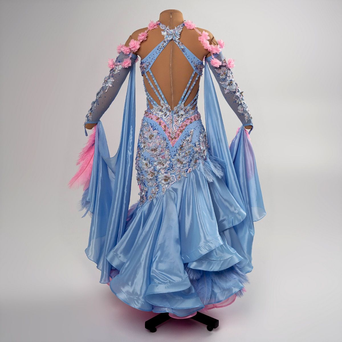 Это платье раскрывает тему конкурса, являясь гармоничным союзом классики и современности, отражая вечное искусство танца, где движения плавны, а образы — нежны и элегантны. Голубой цвет выражает спокойствие и благородство, а розовый — теплоту чувств и романтику. Кружево добавляет изысканной утонченности, создавая эффект лёгкости и воздушности, необходимой для красивого исполнения европейской программы.