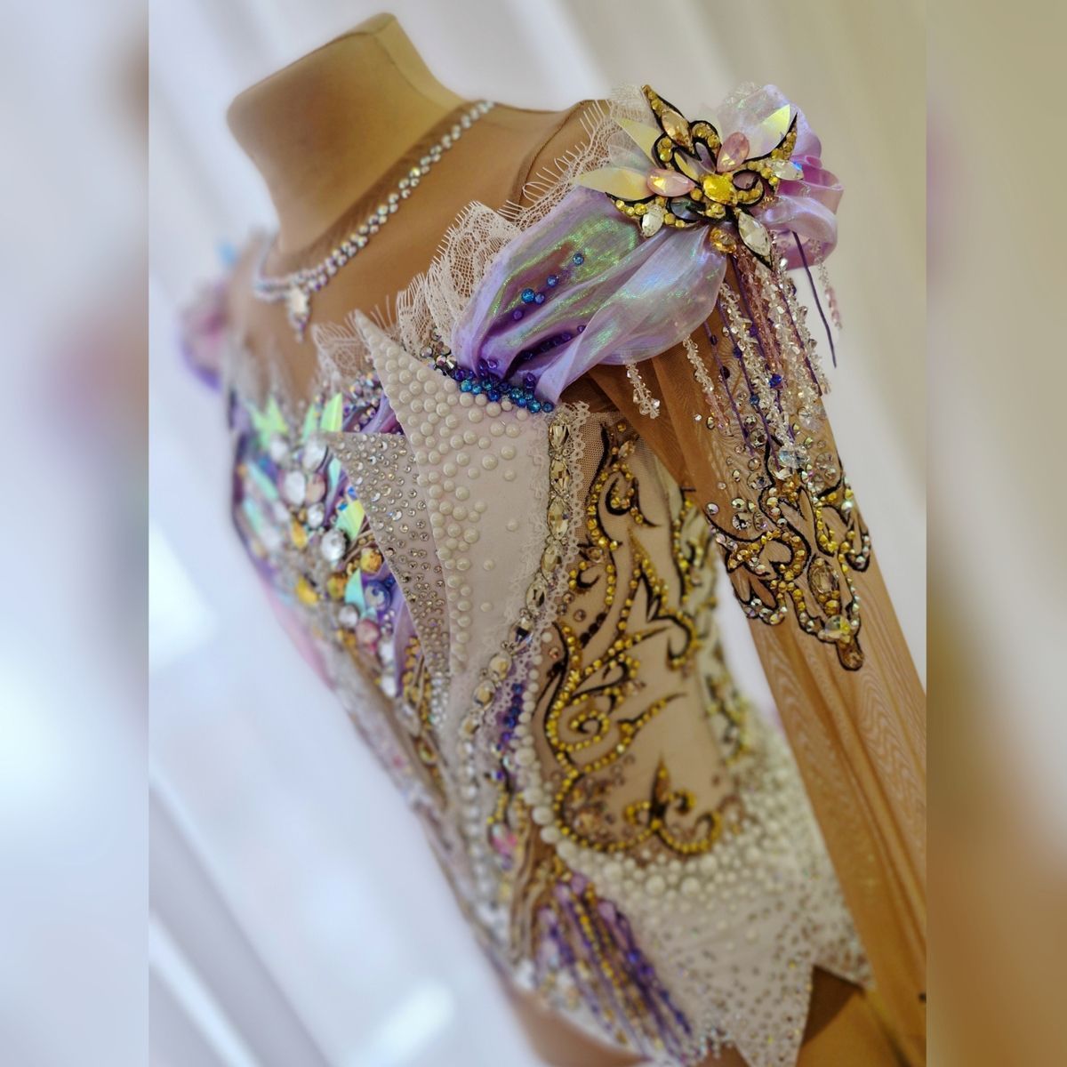 Купальник,  в котором каждая грань сияет, словно отражение бликов  в зеркальном зале Венского бала. Белый фон, золотые узоры , переливы сиреневого и россыпь кристаллов создают эффект настоящей феерии. Каждое движение в нем превращается в танец света и волшебства , делая образ по-настоящему королевским . Он создан , что бы покорять сердца и сиять на ковре , словно вальс под светом хрустальных люстр, превращая гимнастку в настоящую принцессу бала .