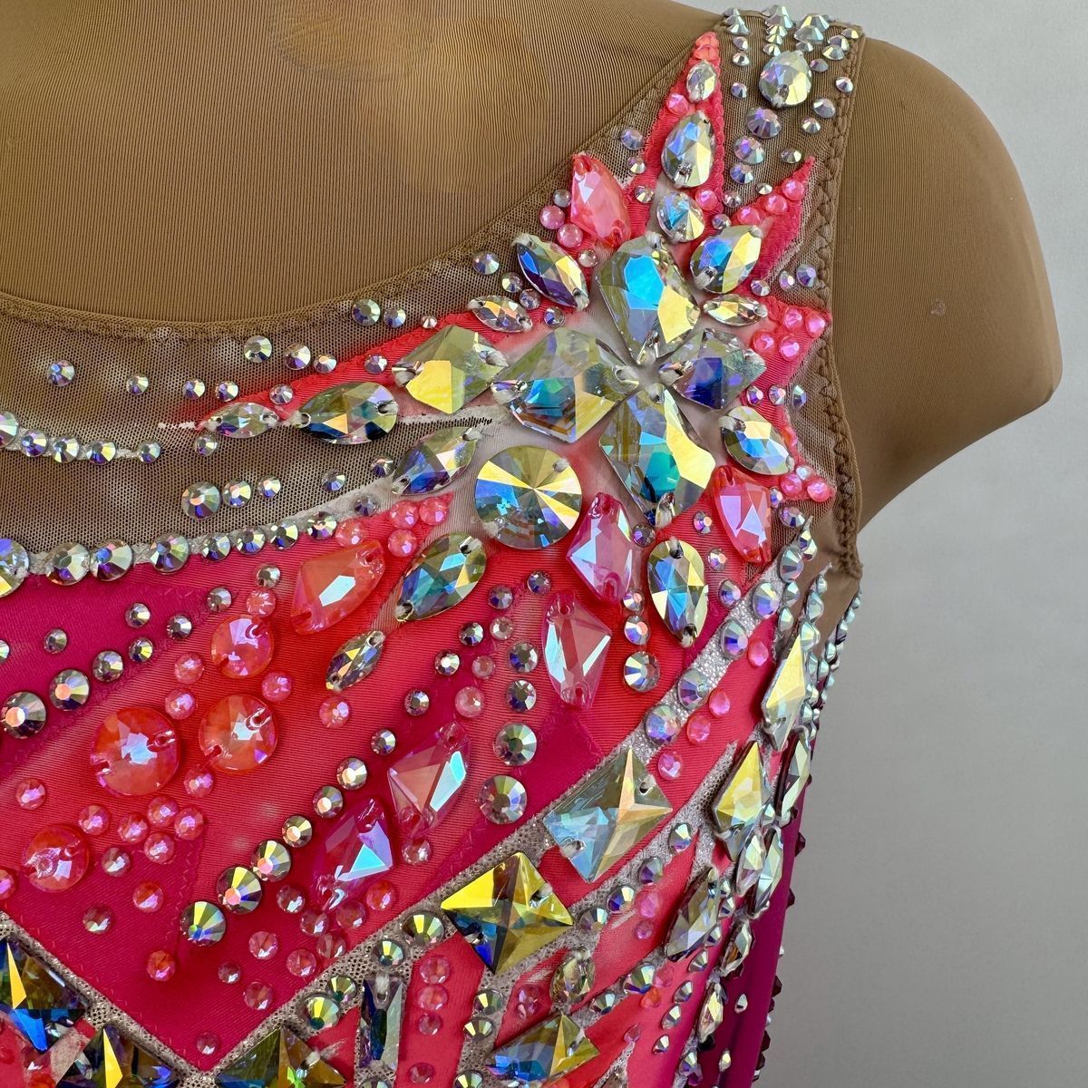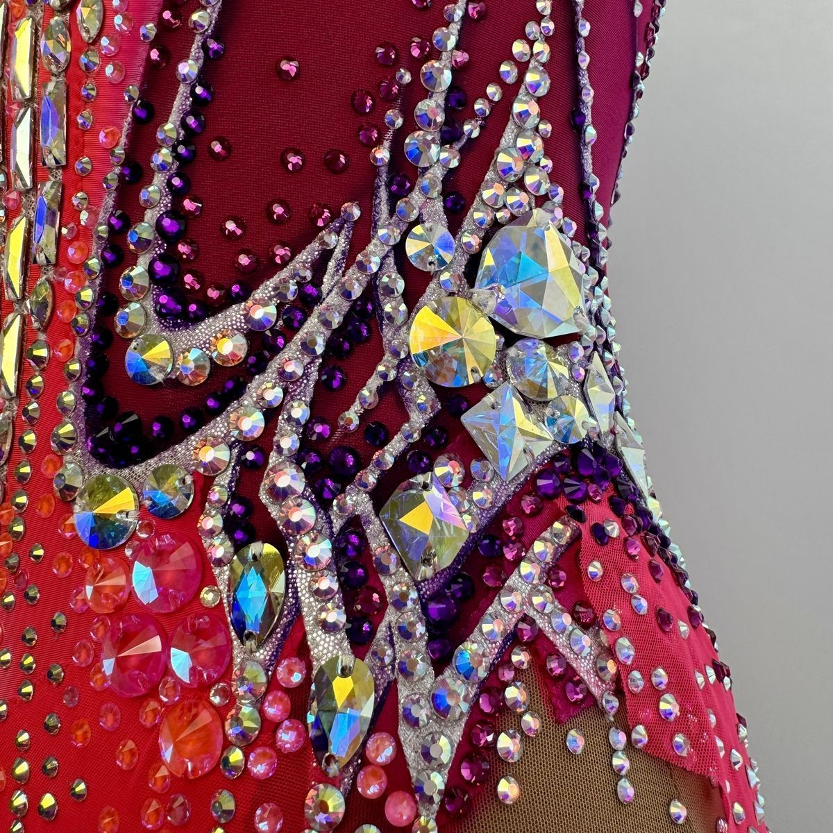 Этот купальник — воплощение изящества Венского бала. Оттенки розового напоминают о бутонах роз в пышных букетах на балах, а мерцающие стразы повторяют блеск хрустальных люстр в роскошном бальном зале. Асимметричный крой и динамичные линии добавляют современной дерзости, создавая гармоничный диалог между классической эстетикой и динамикой художественной гимнастики. В этом наряде юная гимнастка подобна звезде, кружащейся в бессмертном вальсе.