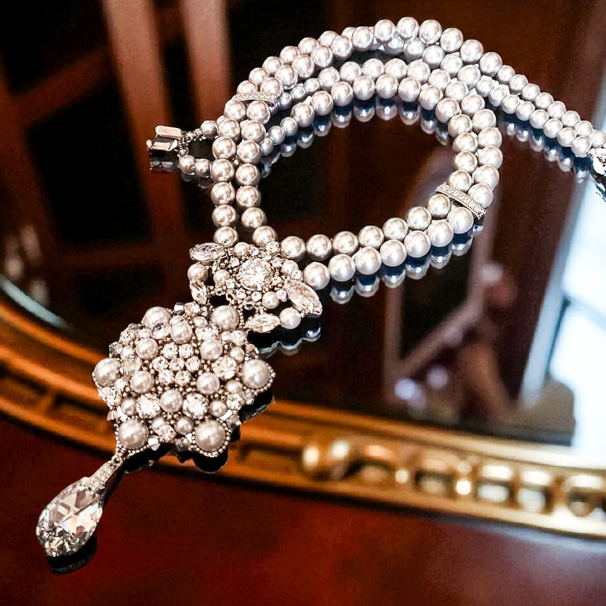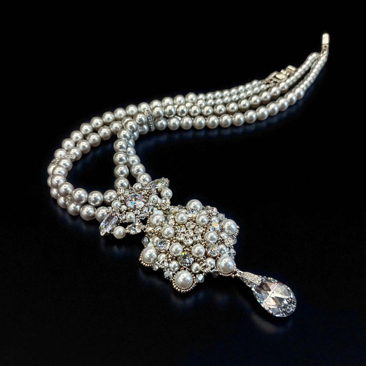 Это колье — воплощение аристократической элегантности и вечной классики. Две изящные нити жемчуга соединяются в роскошный кулон, переливающийся сиянием кристаллов и утончённым блеском жемчужин. Завершающий акцент — каплевидный кристалл, словно луч света, упавший из хрустальной люстры дворца Хофбург.